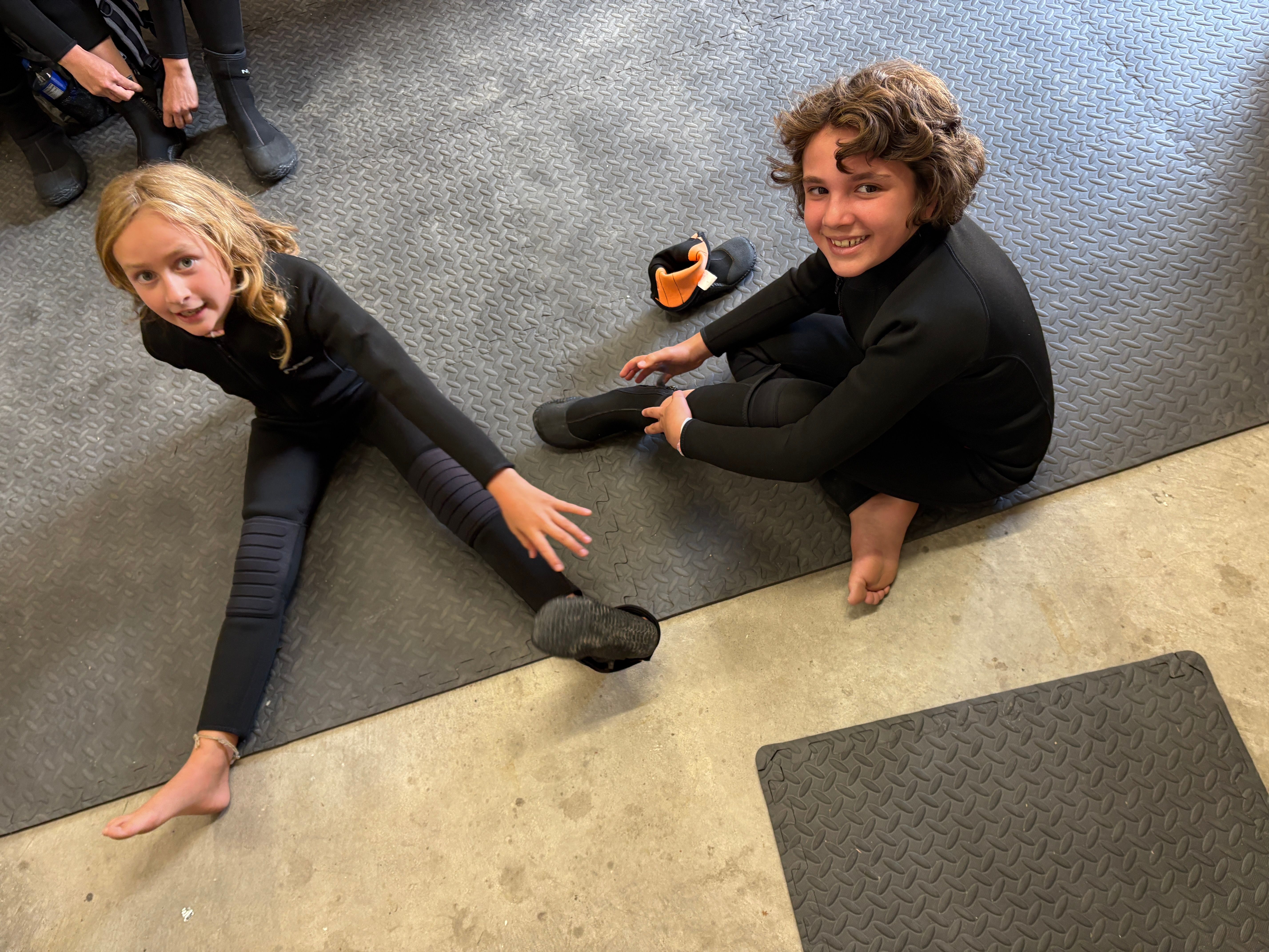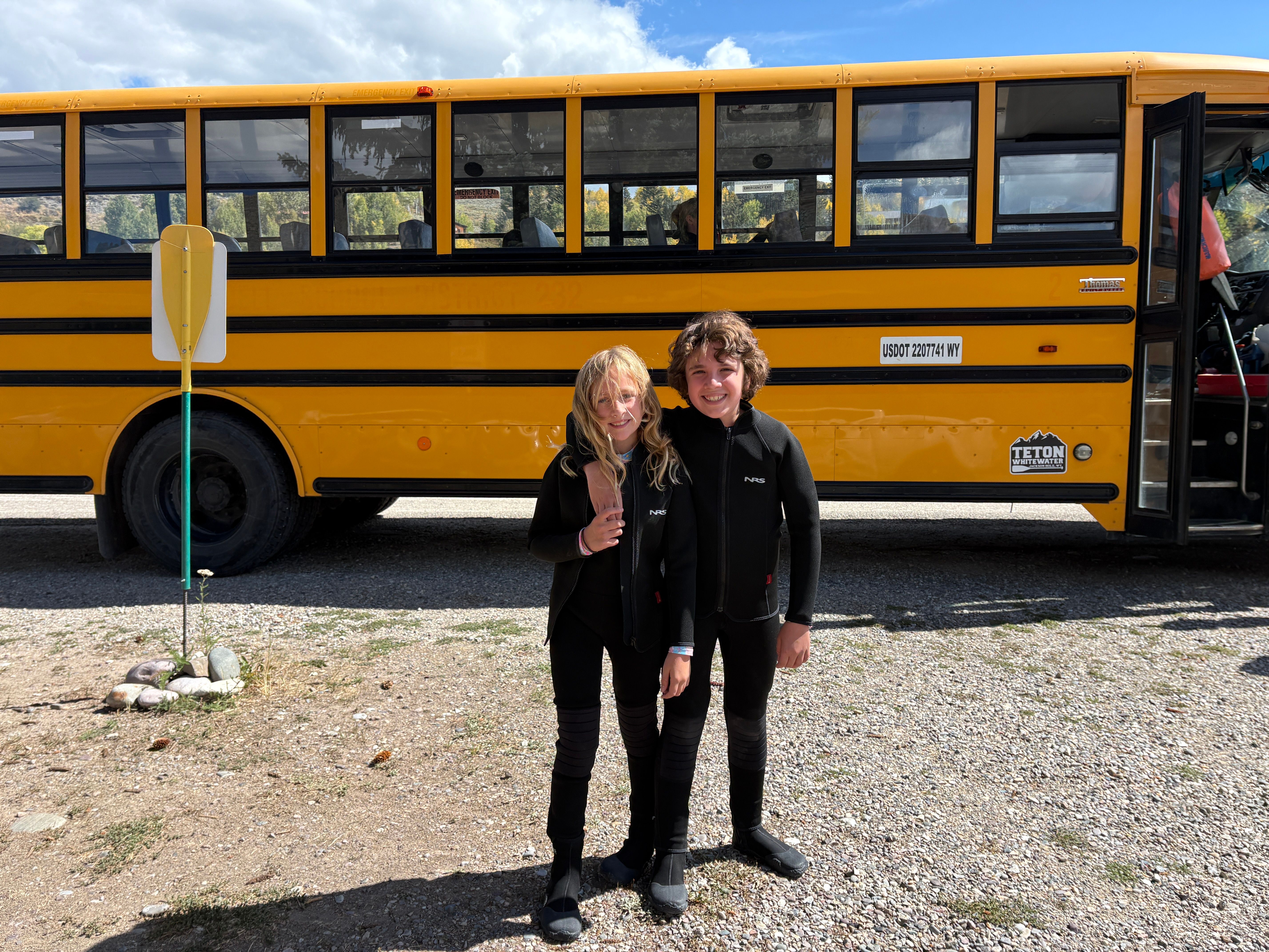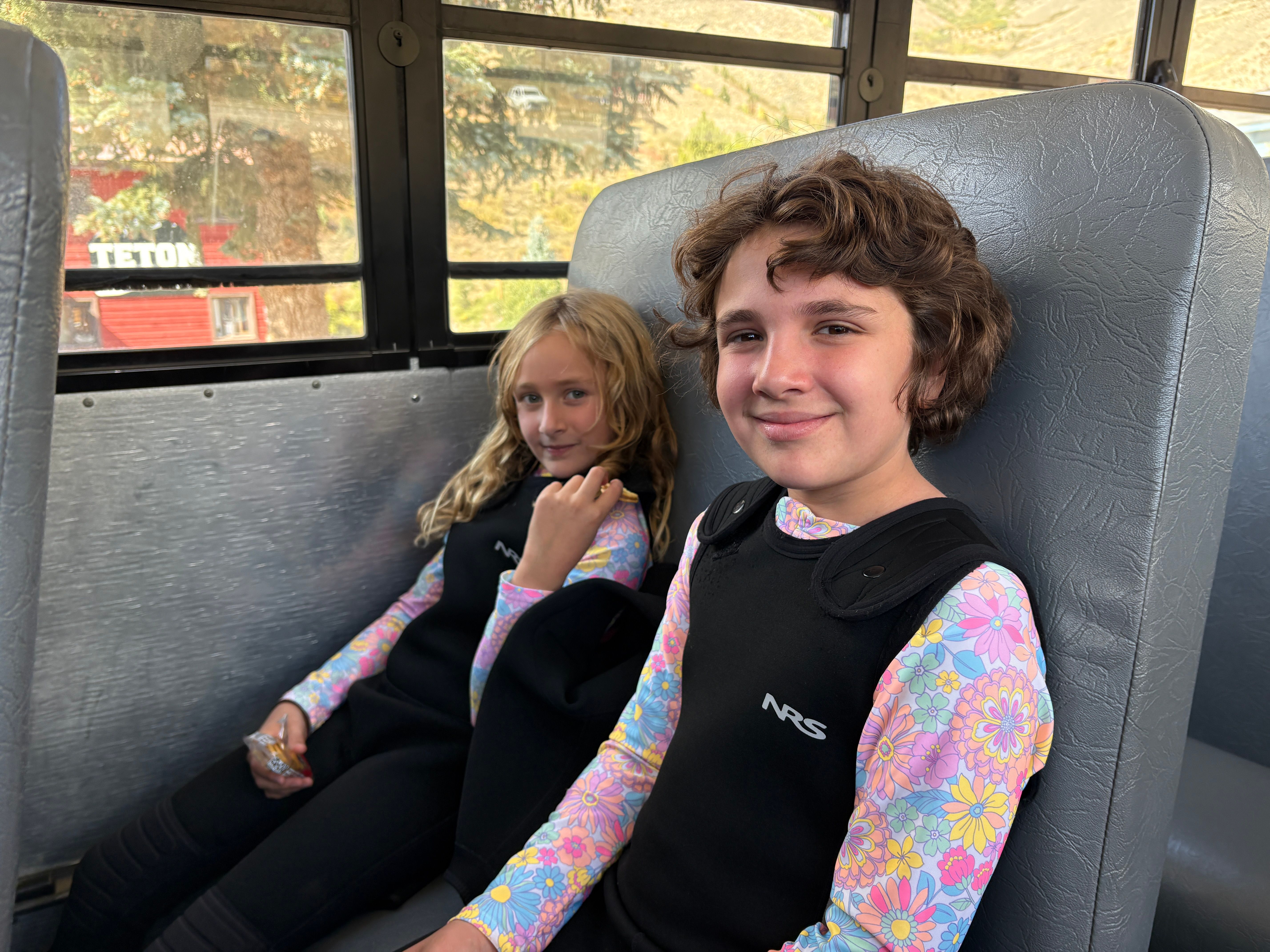 Aaron and Sayer headed out to FINALLY buy that sweet boy some fishing gear and it was time for our rafting adventure. Watching the girls wriggle into their wetsuits had the whole group laughing out loud, and on the bus ride to the put-in, they blasted some awesome ‘80s pump-up music. I couldn’t help thinking how badass the kids must have felt.