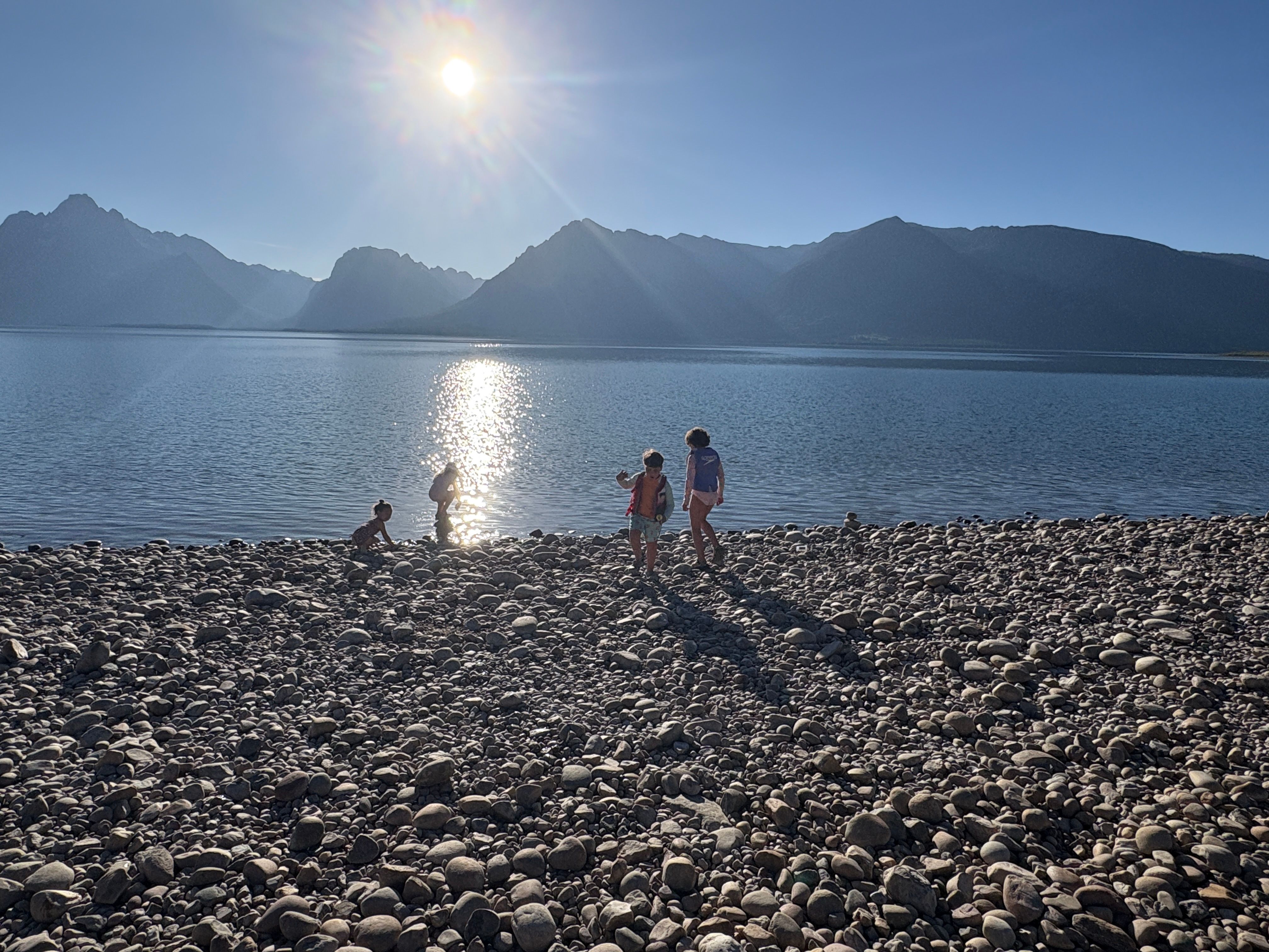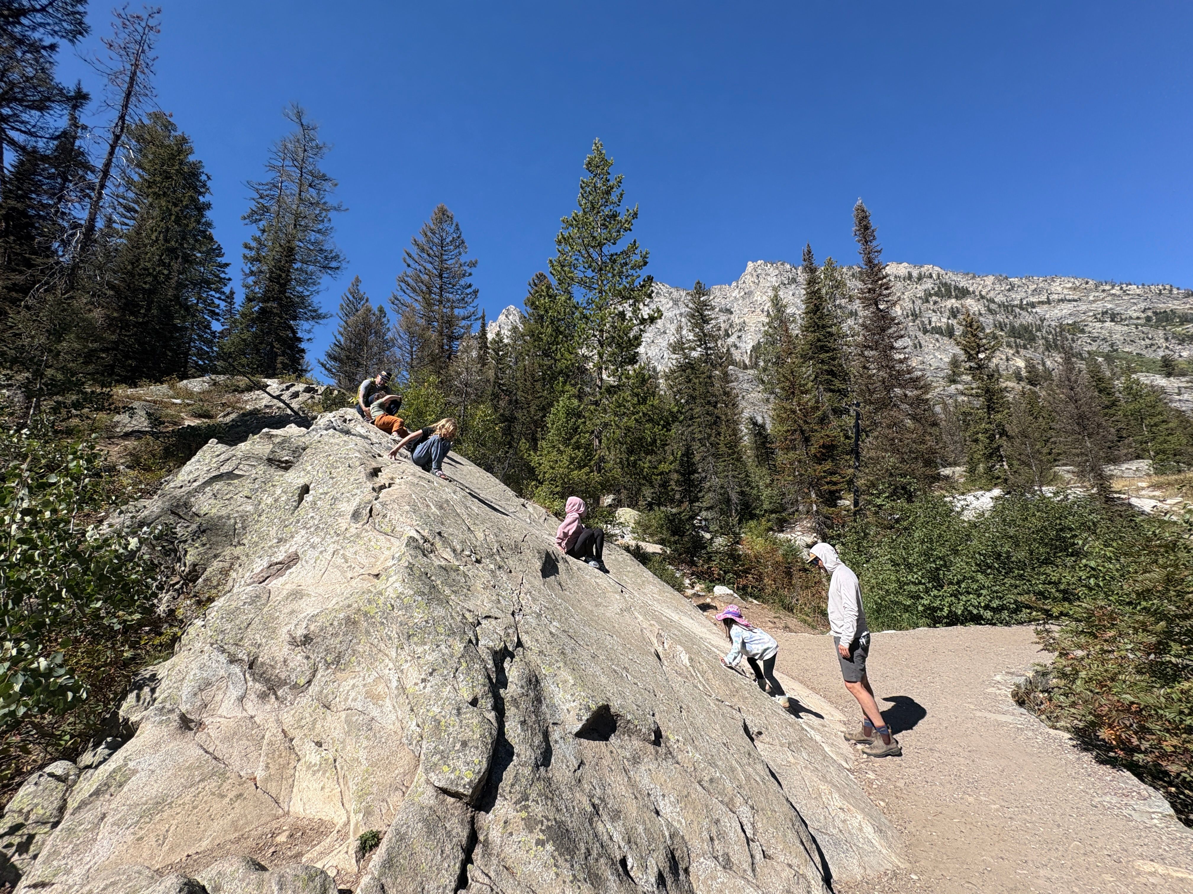 The next day, we set out on a beautiful hike to Taggart Lake, where we finally spotted a big bull moose! We found the perfect picnic spot on a giant rock, this time fully stocked with seriously heavy snacks (I wasn’t messing around after being caught unprepared the day before). The kids had fun wading along the shore, and Aaron even braved an ice-cold plunge in the lake. Oh! And I discovered the missing piece to Sayer actually hiking…he requires dragon-theme audio books playing into his little ears and suddenly he will walk for miles!