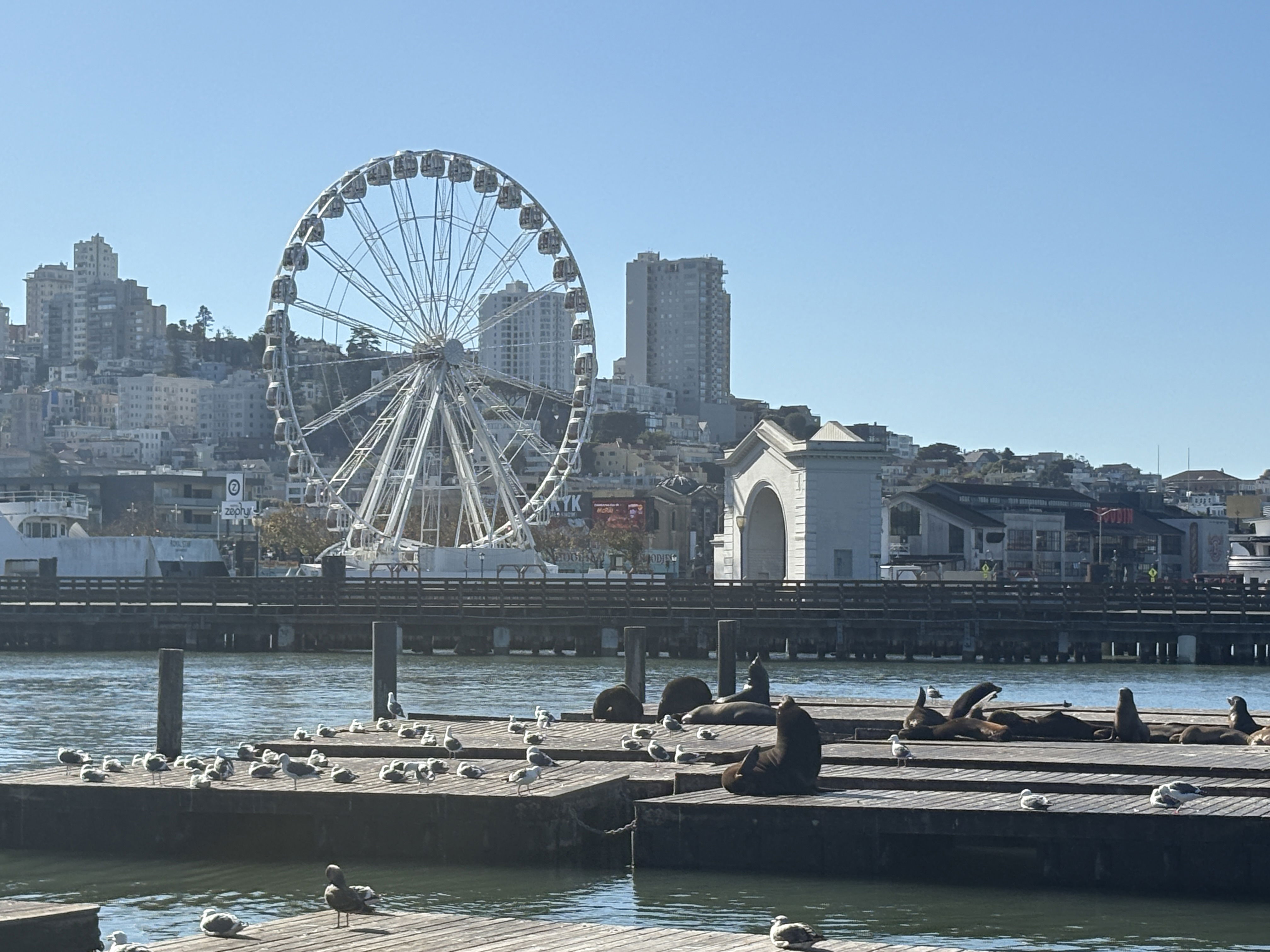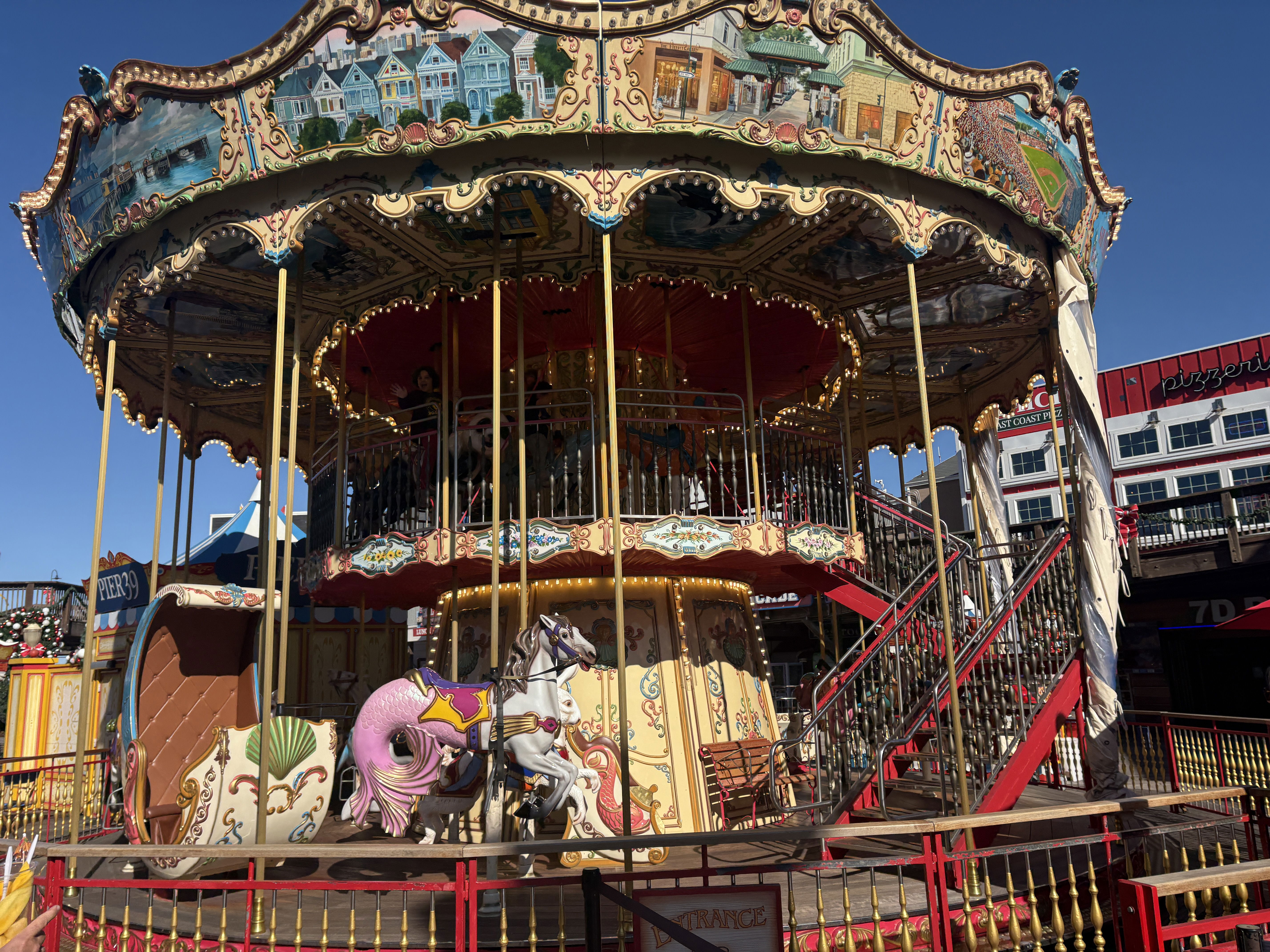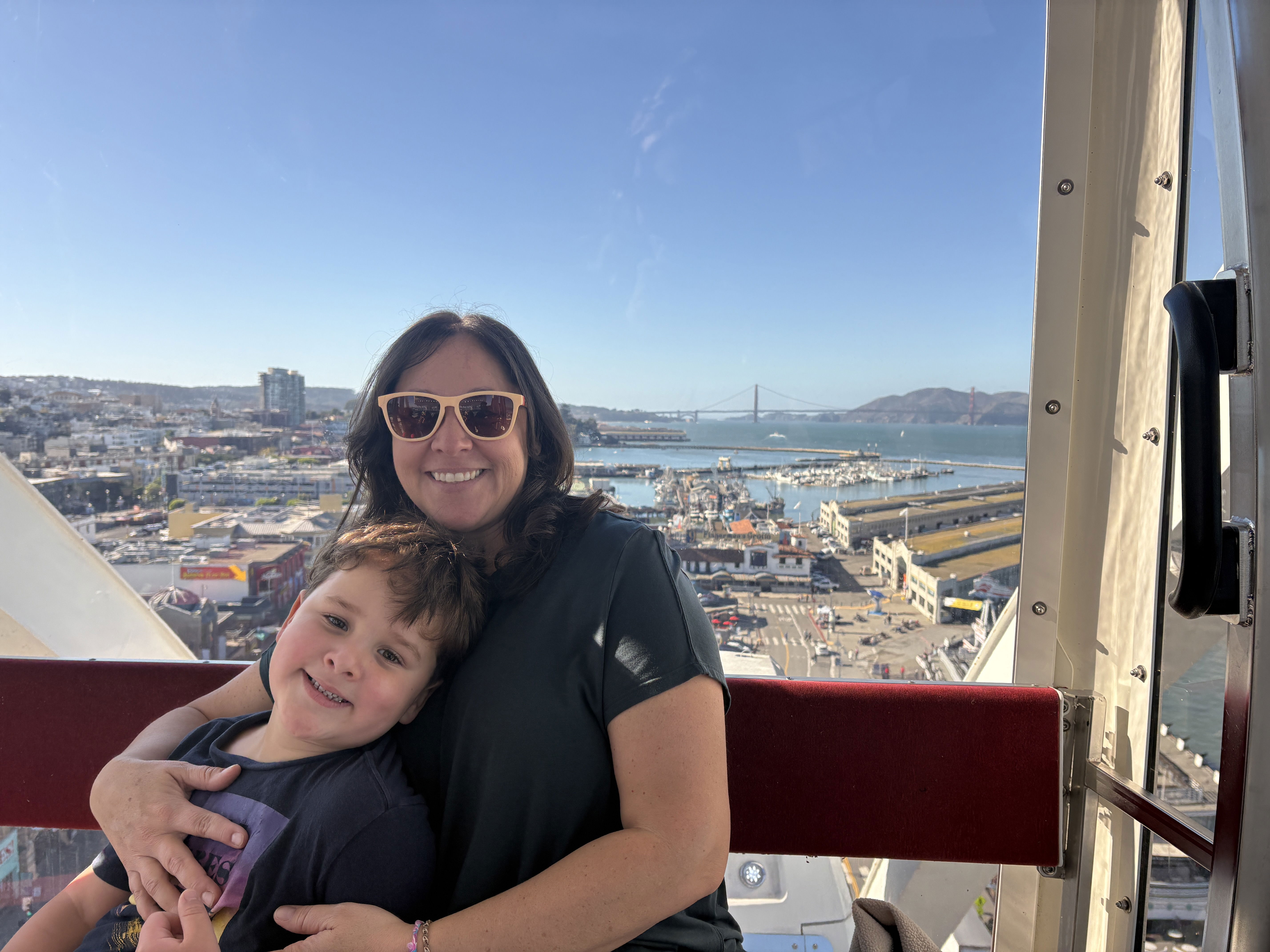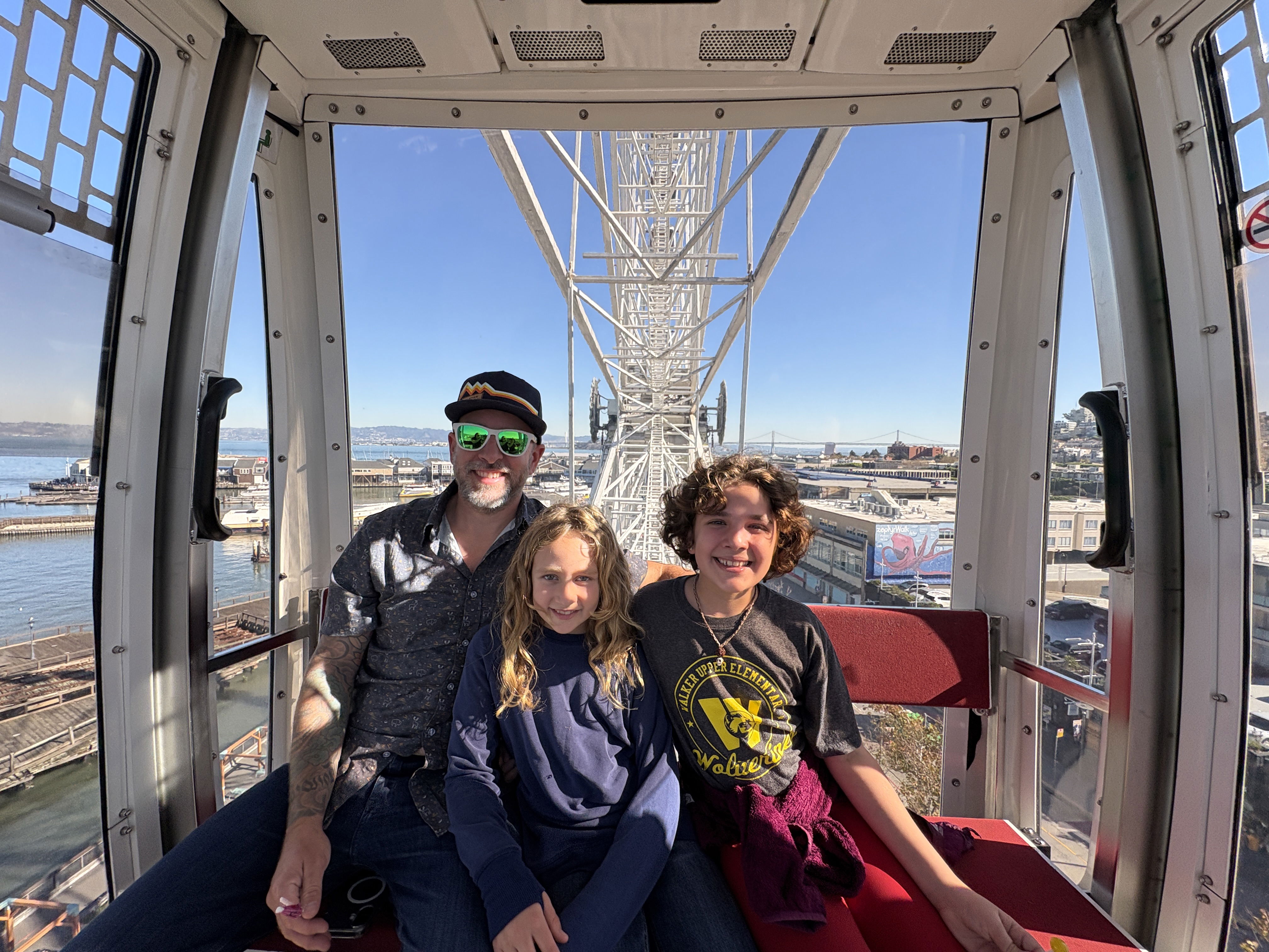 Next up was the big Ferris wheel, which gave us sweeping views of the city and the bay. From the top, we pointed out Alcatraz, the Bay Bridge, and Coit Tower and the kids giggled as they pointed out the tiny sea lions we had seen up close just a few minutes before.