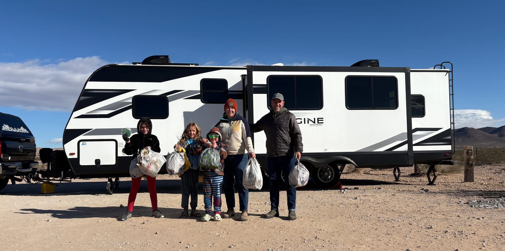 We put on gloves (which usually are used for emptying the tanks) and filled up bags with trash. We found lots of normal things like old fast-food bags, cups, and cans. But we also found glass everywhere, and we even found more than one dirty diaper. Gross! (Who does that?) When we were done, we took the bags to the dumpster and put all that trash where it’s supposed to go.