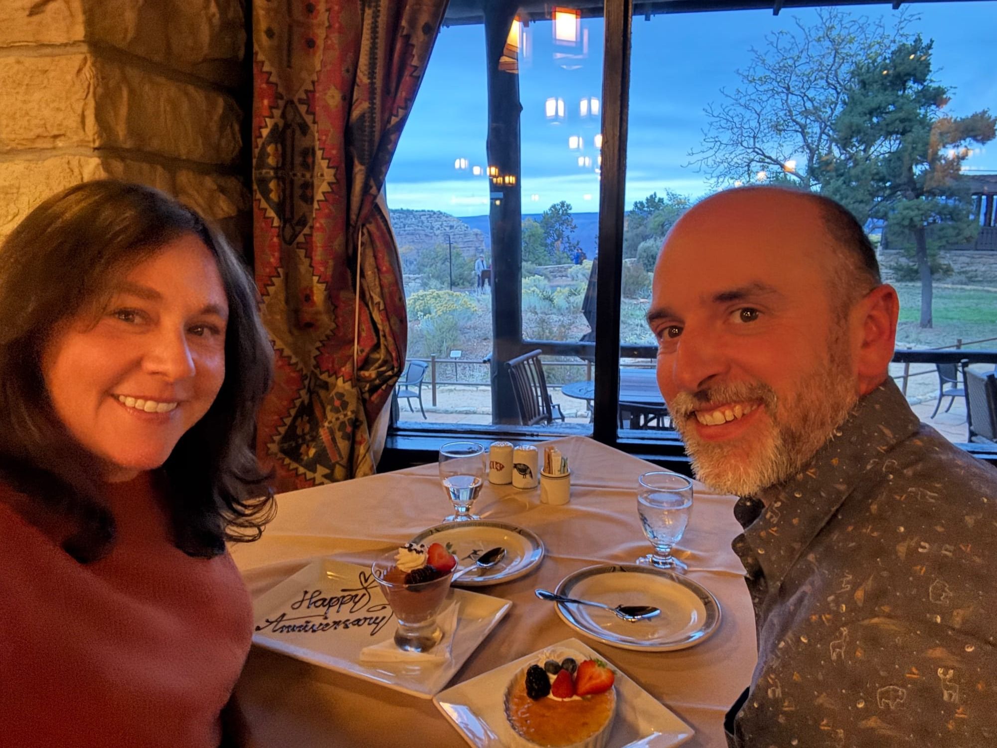 Oh! I almost forgot, Aaron and I celebrated our 12th anniversary here, too. Thanks to my parents (again!), we slipped away for a sweet dinner date at the fancy El Tovar, where we somehow scored the perfect window table overlooking the canyon. Well, I actually know exactly how: right after we sat down at our not-so-great table, a rather intense couple stormed out when they discovered prime rib wasn’t on the menu, leaving their prime spot behind for us. When we got back to the trailer, the lights were off… until the kids jumped out with homemade cards, cupcakes, and decorations. It was the loveliest ending to an already magical night.