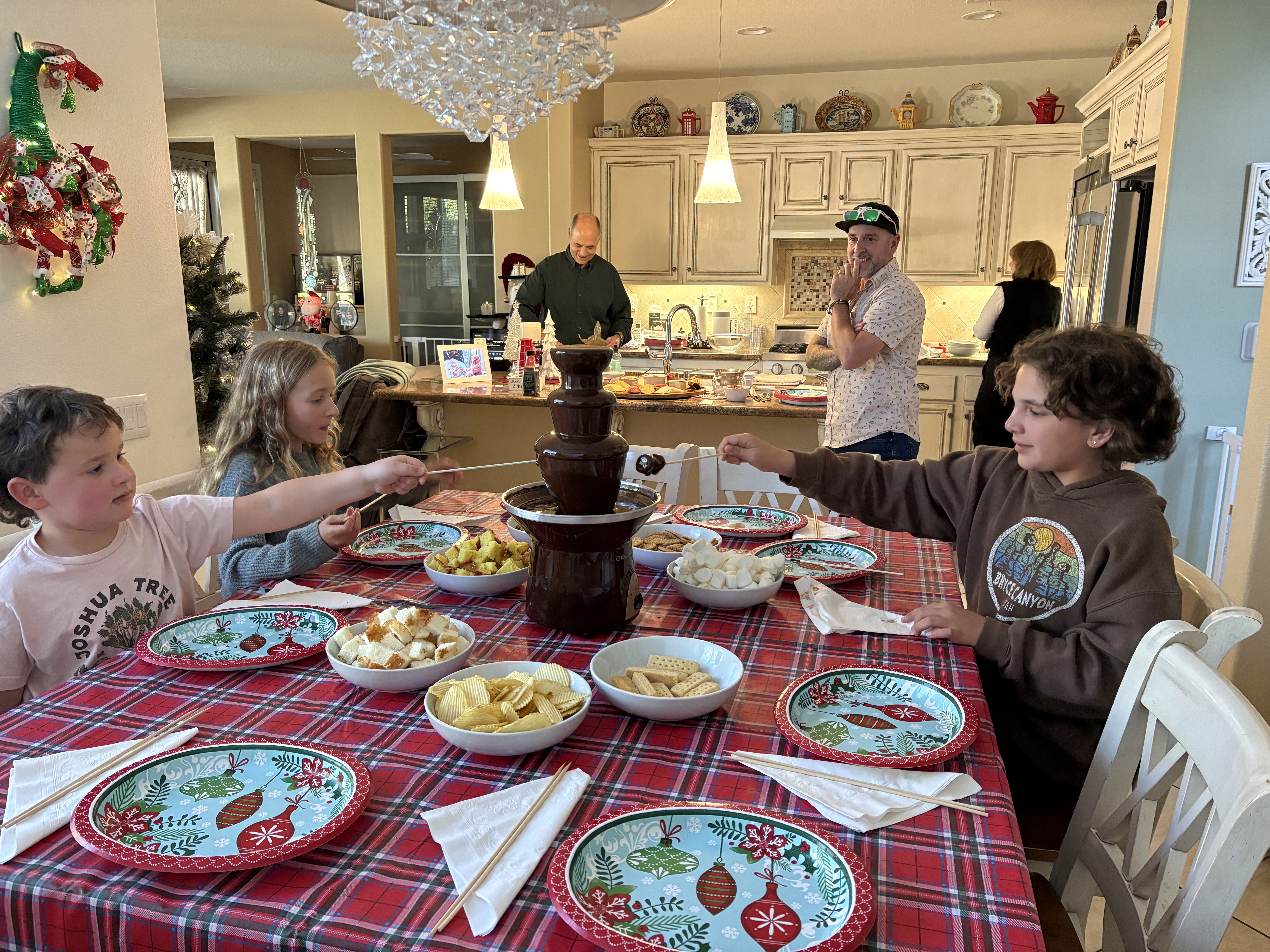 And it only got better from there! When we walked into the kitchen, the table was covered with all sorts of treats and in the center of the table was a GIANT fondue fountain, pouring chocolate! Best. Lunch. Ever. Grantie Kelly and Gruncle Wes (get it? great aunt and uncle!) were so sweet and said they tried to plan a fun new experience since this is our year of new experiences.