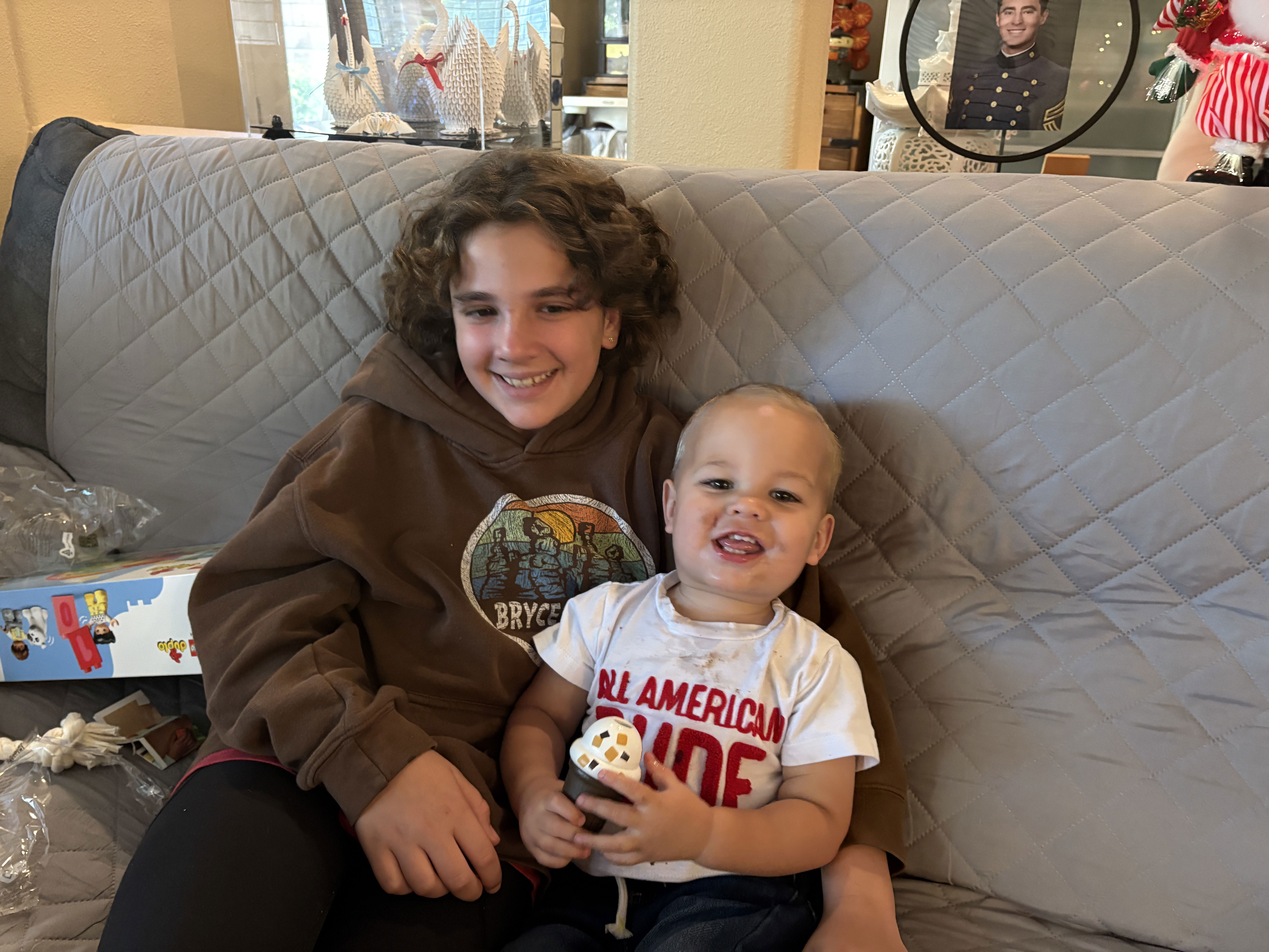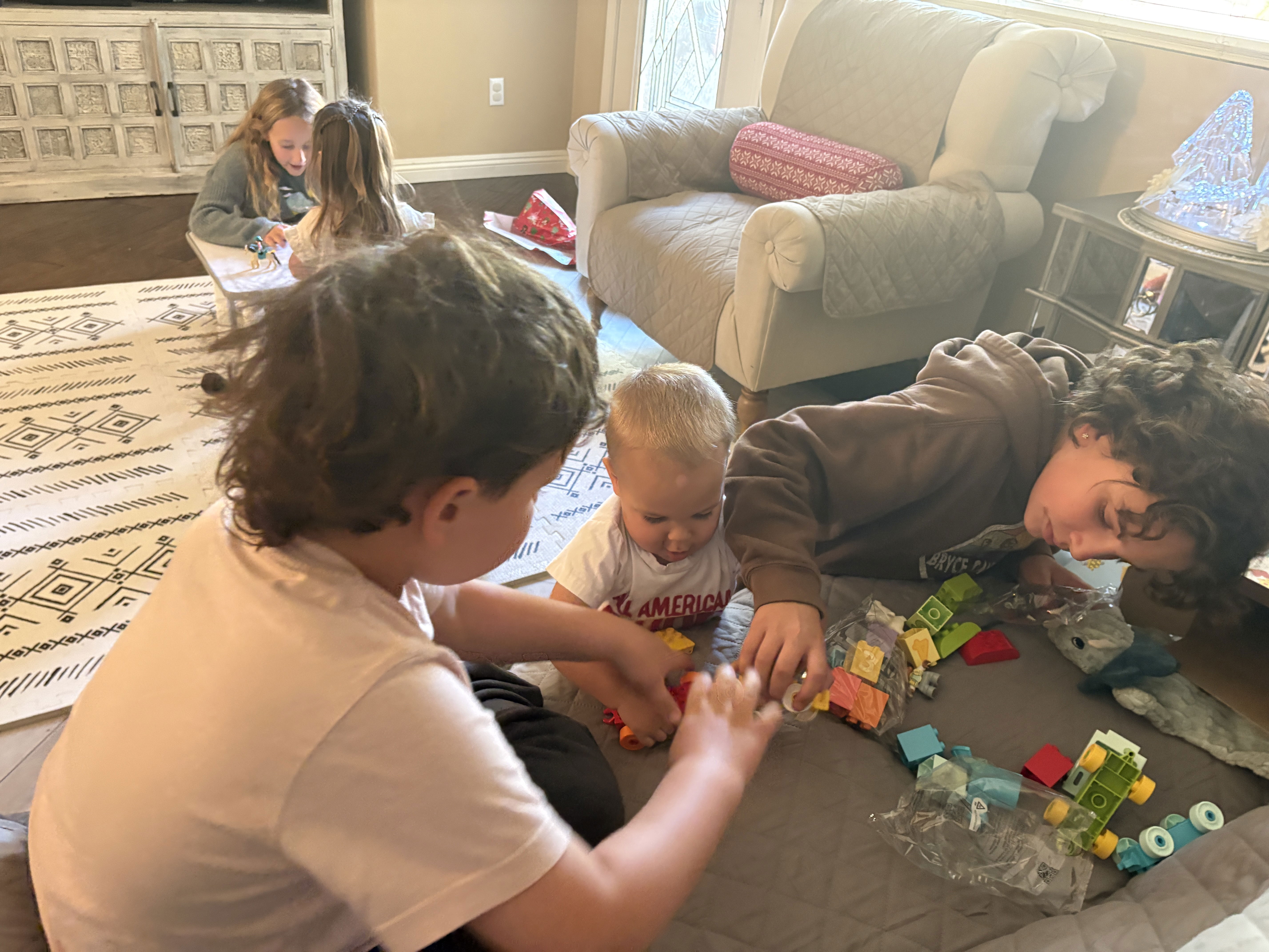 A little later, our second cousins, Rhett and Kennedy arrived with their parents. They were so cute! Rhett was almost two and Kennedy was almost four. We played with them and got to give them little presents we bought. We gave Kennedy a horsey lego set and she liked it so much she asked Grier to take it apart for her so she could rebuild it. For Rhett, we got him a cute train duplo set that Demory helped him with and he and Sayer had fun playing with for a while. Sayer loved playing with their French Bulldogs, Mochi and Katie and spent a lot of time running in circles with them chasing him. Grier also had fun running around with them and Kennedy in the back yard.
