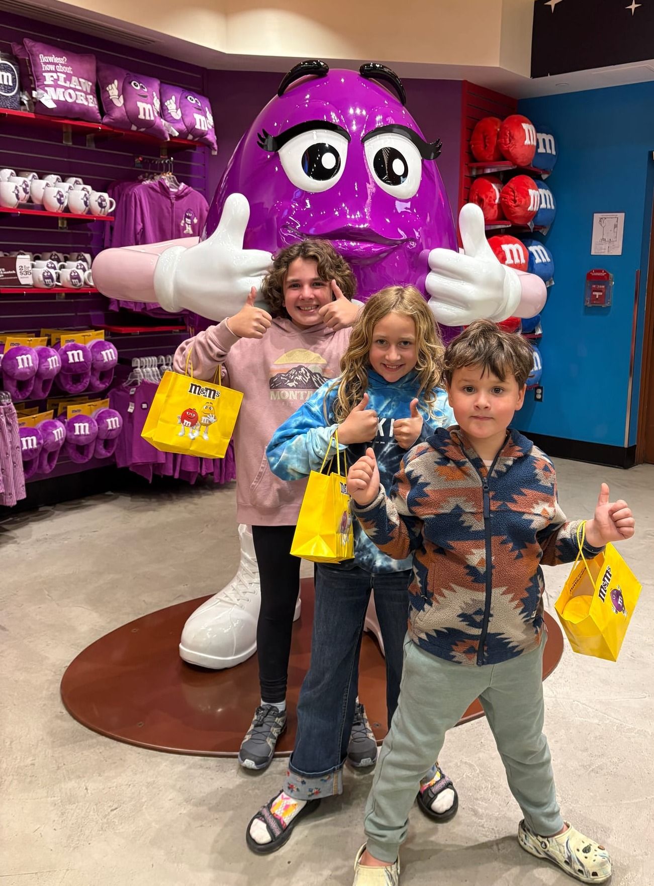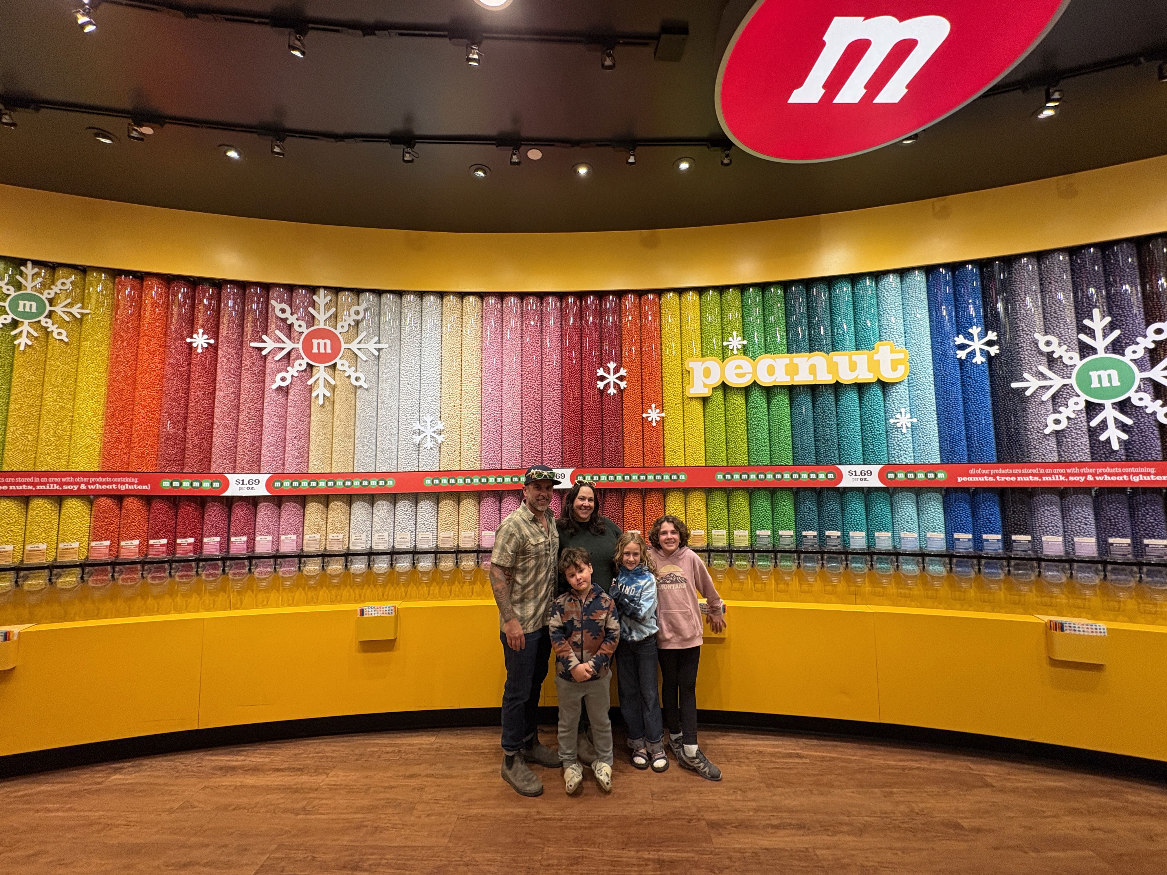 After that, we went to the M&M store, which was AMAZING. The whole place smelled like the most delicious chocolate,🍫 and the smell hit you on the sidewalk before you even walked through the door. There were four floors and an escalator to take you up to them. On the second floor, there was a huge M&M wall that looked like a rainbow. There were at least 50 flavors to choose from and even more colors! We each got to fill up a cup. Demory got mostly mint because it was so good, and Sayer got all pumpkin pie!🥧