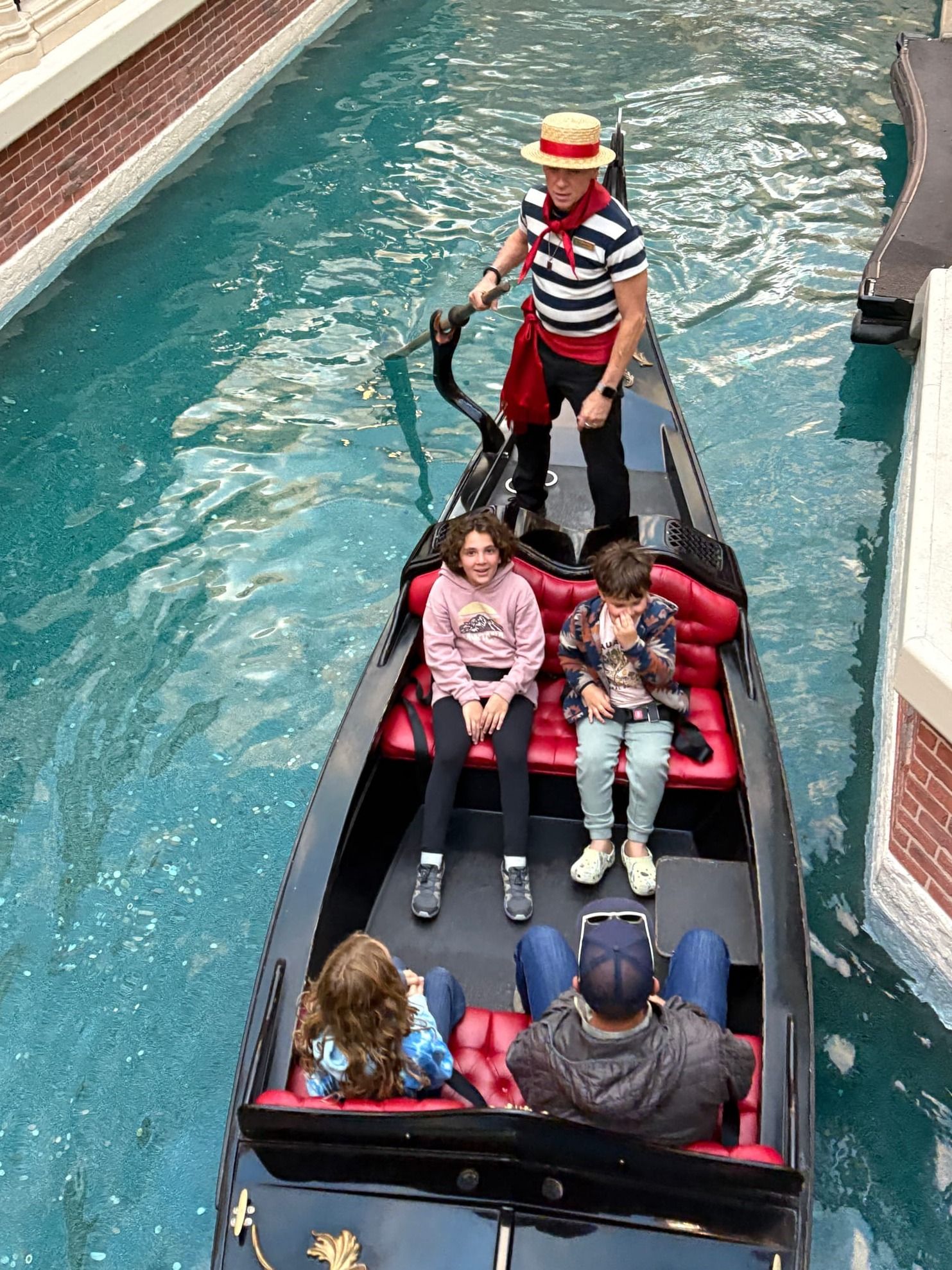 Another day, we went to The Venetian Hotel, and it was super cool. We rode on a gondola, and our gondolier sang to us🎶. The craziest part was that the canals were inside, but the ceiling was painted with clouds☁️ and looked like we were outside!