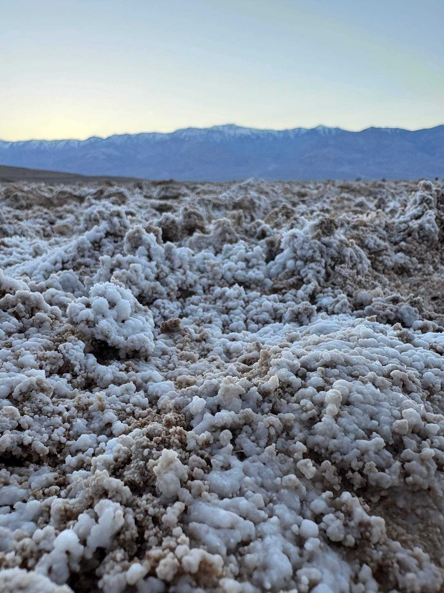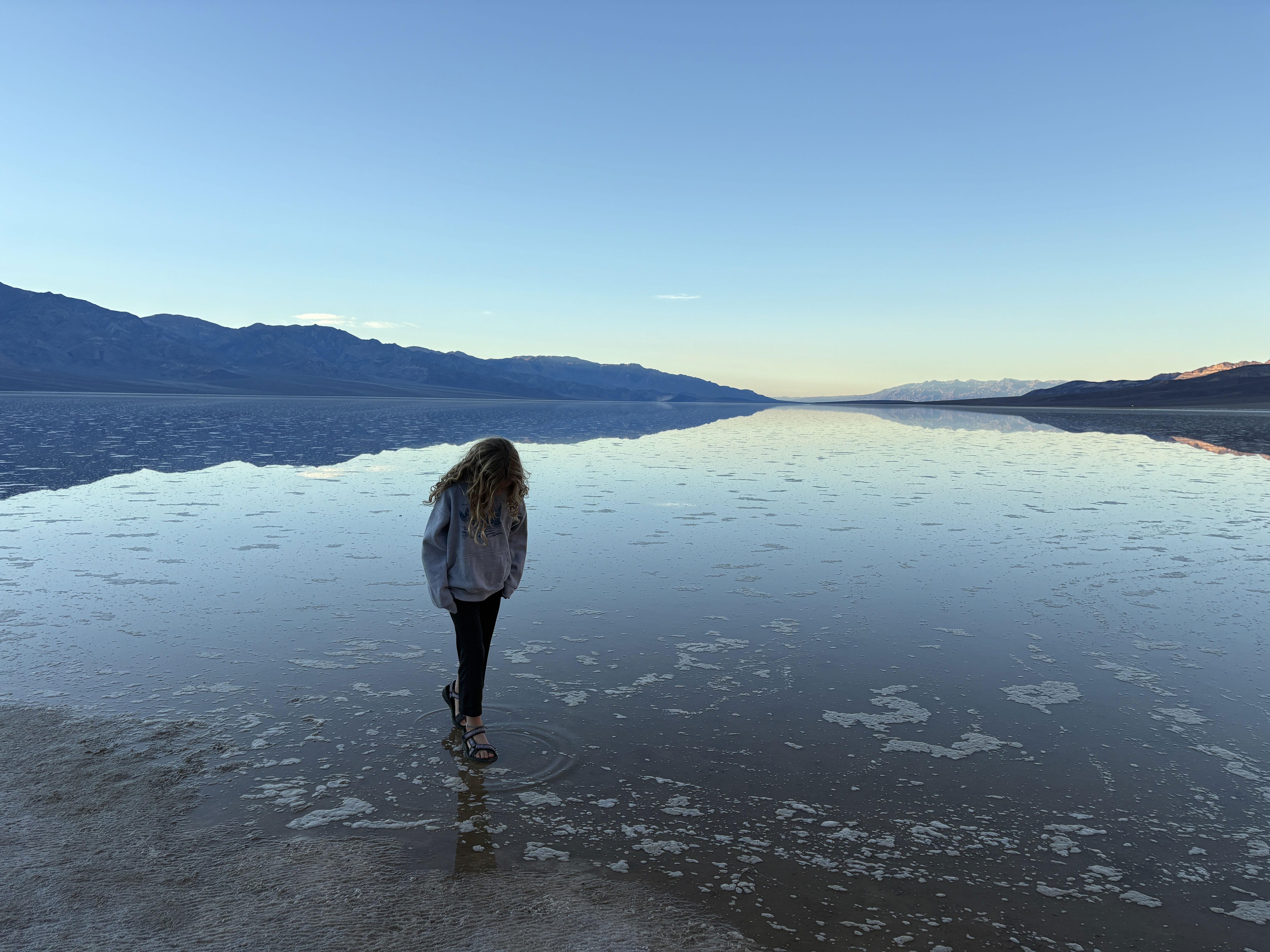 The next day, we took a road trip on our road trip (hehe) to Death💀 Valley, the lowest point in North America at 283 feet below sea🌊 level. We walked out on the salt flats, where Demory, Mom, and I did a tiny lick of the salt while Sayer put a whole chunk in his mouth. It looked disgusting😝, and he spit it out right away! It was pretty unique because there had been a big flood recently, so the basin had a lot of water in it. The reflection of the mountains in the super salty water was chef’s kiss😙.
