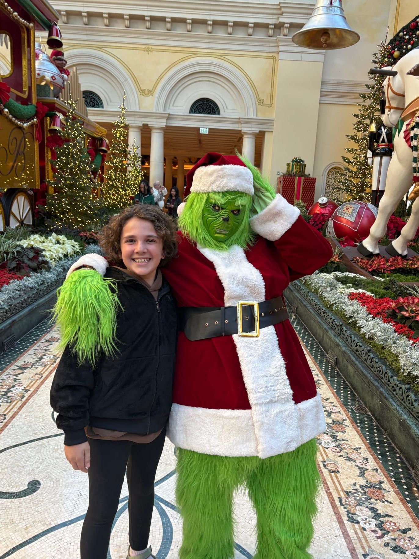 First, we went to the Bellagio and visited the conservatory, which was filled with Christmas cheer (except when the Grinch came along!😈). There was the biggest nutcracker I’ve ever seen and guess what?! It was made out of roses🌹! There was also a giant train🚂 that we could walk through, with silly elves🧝🏾♀️🧝🏻 all around, and a fountain decorated with huge Christmassy instruments.